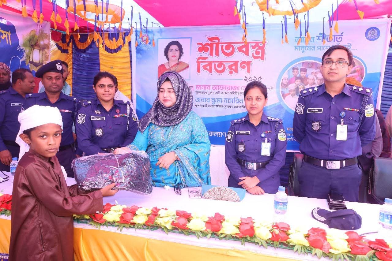 ময়মনসিংহ পুলিশ নারী কল্যাণ সমিতি (পুনাক) এর সভানেত্রী ঝুমা নাসরিন এর সভাপতিত্বে মাদ্রাসার শিক্ষার্থীদের মাঝে শীতবস্ত্র বিতরণ অনুষ্ঠানে