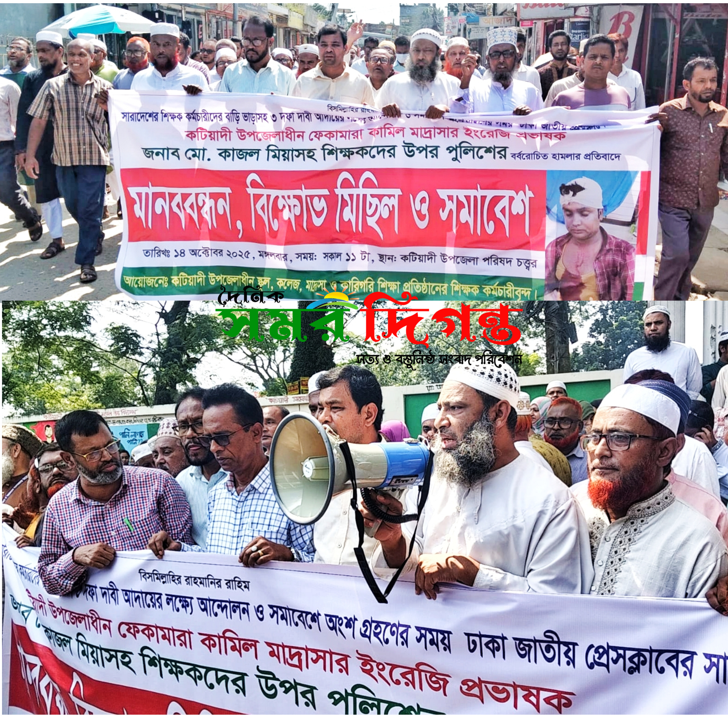 মঙ্গলবার (১৪ অক্টোবর) দুপুরে উপজেলা পরিষদ চত্বরে আয়োজিত সমাবেশে বক্তব্য রাখেন ফেকামারা কামিল মাদ্রাসার অধ্যক্ষ মাওলানা আবুল কাসেম বিপ্লব, আব্দুল মান্নান মহিলা কলেজের ভারপ্রাপ্ত অধ্যক্ষ মো. সিদ্দিকুর রহমান, মুন্সী আ. হেকিম কারিগরি কলেজের অধ্যক্ষ ফজলুল হক জোয়ারদার আলমগীর, কটিয়াদী পাইলট বালিকা উচ্চ বিদ্যালয়ের প্রধান শিক্ষক ছালাহ উদ্দিন ভুইয়া সবুজ, কটিয়াদী আদর্শ উচ্চ বিদ্যালয়ের প্রধান শিক্ষক নজরুল ইসলাম ফকির, লোহাজুরী উচ্চ বিদ্যালয় ও কলেজের ভারপ্রাপ্ত অধ্যক্ষ শাহ্ মো. আনোয়ার হোসেন, গণঅধিকার পরিষদের জেলা সহ-সভাপতি সৈয়দ আলিউজ্জামান মহসিন ও এনসিপির জেলা সহসভাপতি কাওছার আহমেদ প্রমুখ।