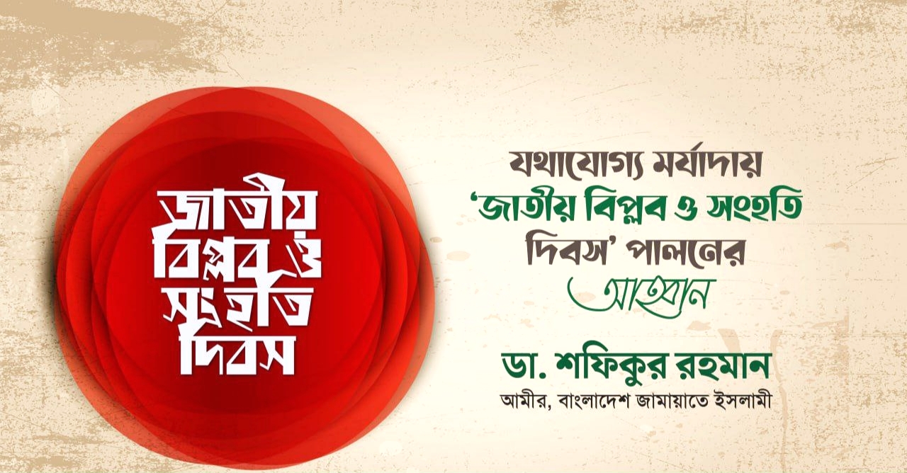 ৭ নভেম্বর যথাযোগ্য মর্যাদায় ‘জাতীয় বিপ্লব ও সংহতি দিবস’ পালনের আহ্বান জানিয়ে বাংলাদেশ জামায়াতে ইসলামীর আমীর ডা. শফিকুর রহমান ৫ নভেম্বর নিম্নোক্ত বিবৃতি প্রদান করেছেন।