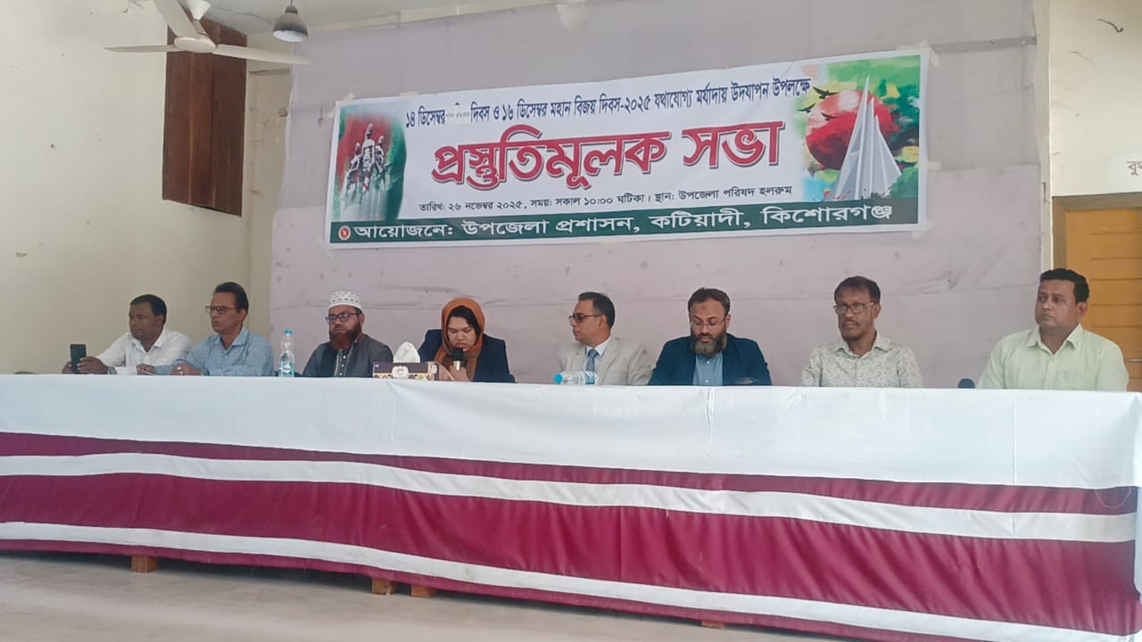 কিশোরগঞ্জের কটিয়াদী উপজেলা প্রশাসানের আয়োজনে ১৪ ডিসেম্বর শহিদ বুদ্ধিজীবী দিবস ও ১৬ ডিসেম্বর মহান বিজয় দিবস যথাযোগ্য মর্যাদায় উদযাপন উপলক্ষে প্রস্তুতিমূলক সভা অনুষ্ঠিত হয়েছে। বুধবার সকল ১১ টায় উপজেলা হলরুমে উপজেলা নির্বাহী অফিসার ভারপ্রাপ্ত ও