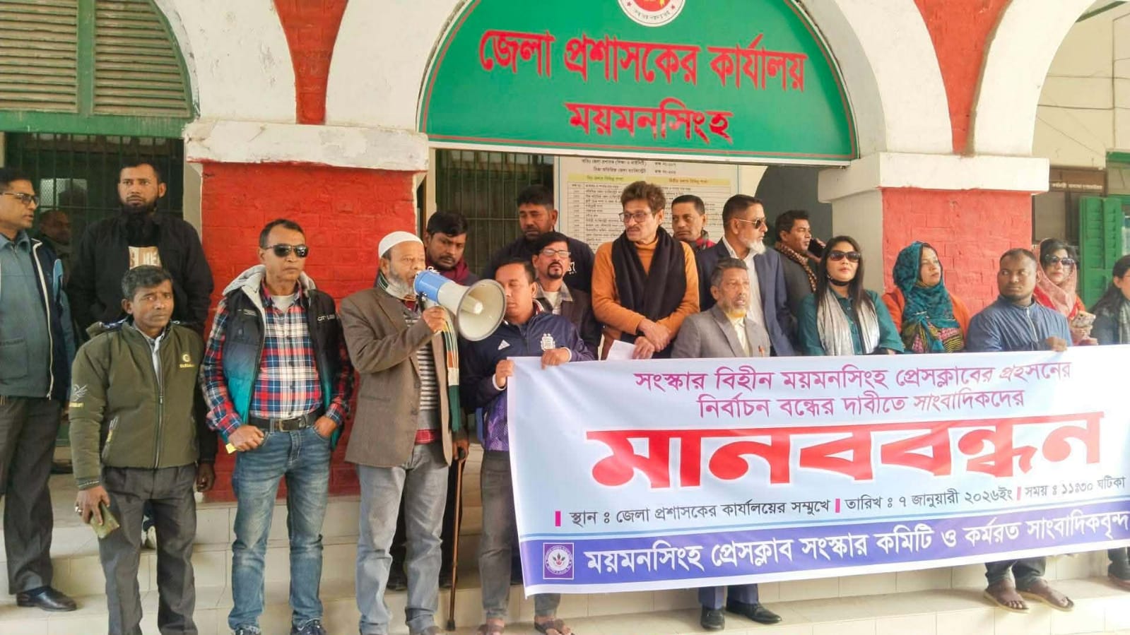 জেলা প্রশাসককে ময়মনসিংহ প্রেসক্লাবের সভাপতির পদ থেকে সরে যাওয়া এবং সংস্কার ছাড়া প্রহসনের নির্বাচন বাতিলের দাবীতে সাংবাদিকদের মানববন্ধন অনুষ্ঠিত হয়েছে। বুধবার ০৭ জানুয়ারী বেলা ১২ টায় ময়মনসিংহ জেলা প্রশাসকের কার্যালয়ের সামনে ময়মনসিংহ প্রেসক্লাব সংস্কার কমিটির আয়োজনে এই মানববন্ধন অনুষ্ঠিত হয়।