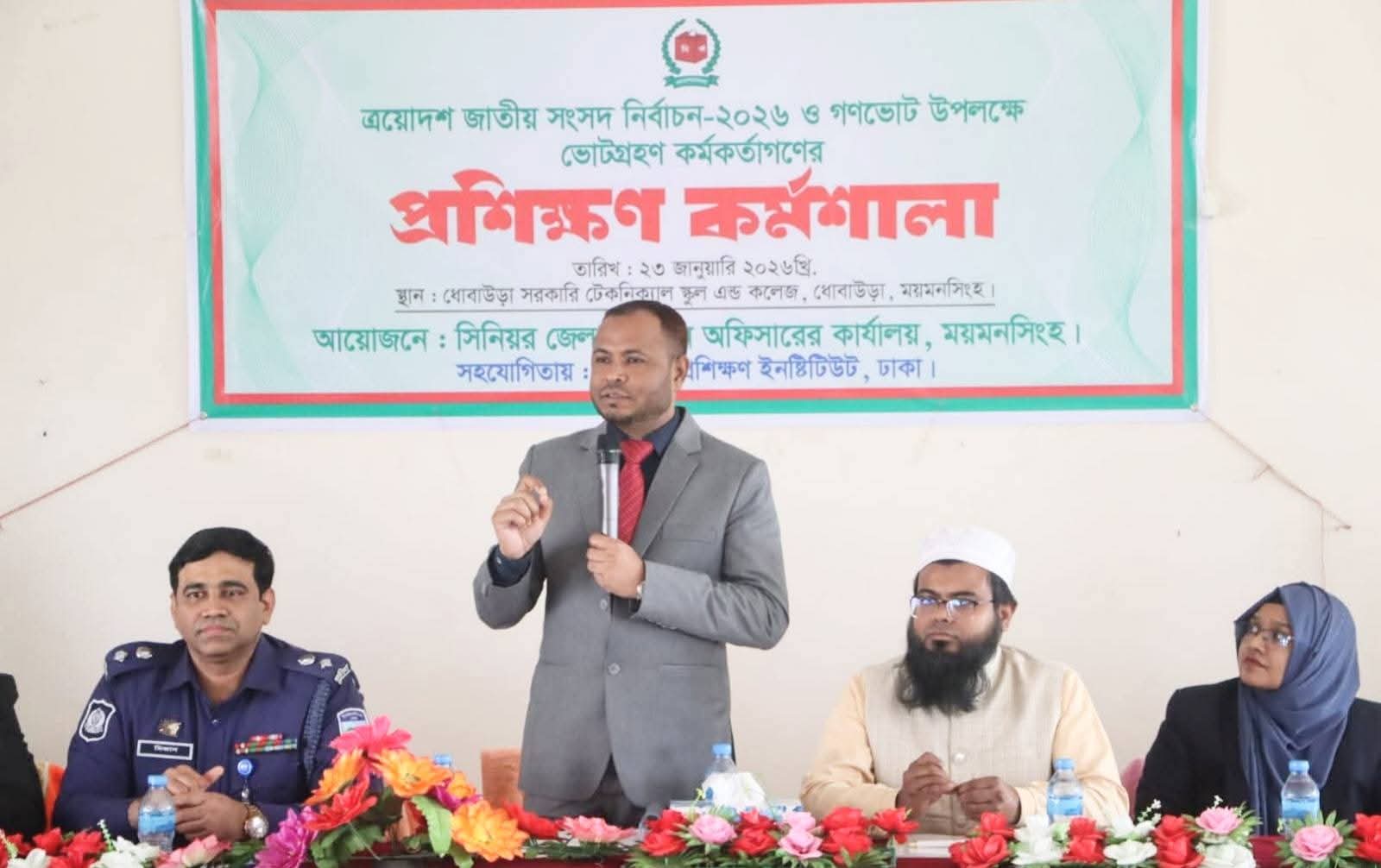 শুক্রবার (২৩ জানুয়ারি ২০২৬) নির্বাচনী প্রশিক্ষণ ইনষ্টিটিউট, ঢাকার সহযোগিতায়, সিনিয়র জেলা নির্বাচন অফিসারের কার্যালয় ময়মনসিংহের আয়োজনে ধোবাউড়া সরকারি টেকনিক্যাল স্কুল এন্ড কলেজের হল রুমে এই প্রশিক্ষণ কর্মশালা অনুষ্ঠিত হয়। উক্ত অনুষ্ঠানে প্রধান অতিথি হিসেবে উপস্থিত ছিলেন জেলা প্রশাসক ও রিটার্ণিং অফিসার মোঃ সাইফুর রহমান। বিশেষ অতিথি হিসেবে উপস্থিত ছিলেন জেলা পুলিশ সুপার মোঃ মিজানুর রহমান।