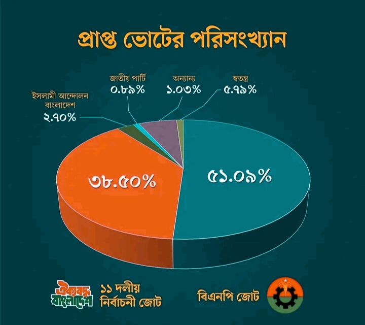 Do not be disheartened or distracted by selective media presentations of the results. The actual numbers tell a far stronger story. Out of approximately 70 million votes cast, the Jamaat-led alliance secured 38.50% translating into nearly 27 million citizens placing their trust in this movement. That is a national mandate of immense scale and significance.
