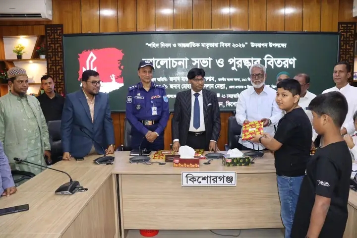 শনিবার, ২১ ফেব্রুয়ারি ২০২৬ খ্রি: সকাল ১১:০০ ঘটিকায় কিশোরগঞ্জ জেলা প্রশাসকের সম্মেলন কক্ষে জেলা প্রশাসক মোহাম্মদ আসলাম মোল্লার সভাপতিত্বে শহীদ দিবস ও আন্তর্জাতিক মাতৃভাষা দিবস ২০২৬ উদযাপন উপলক্ষে একটি আলোচনা সভা ও পুরস্কার বিতরণী অনুষ্ঠান অনুষ্ঠিত হয়।