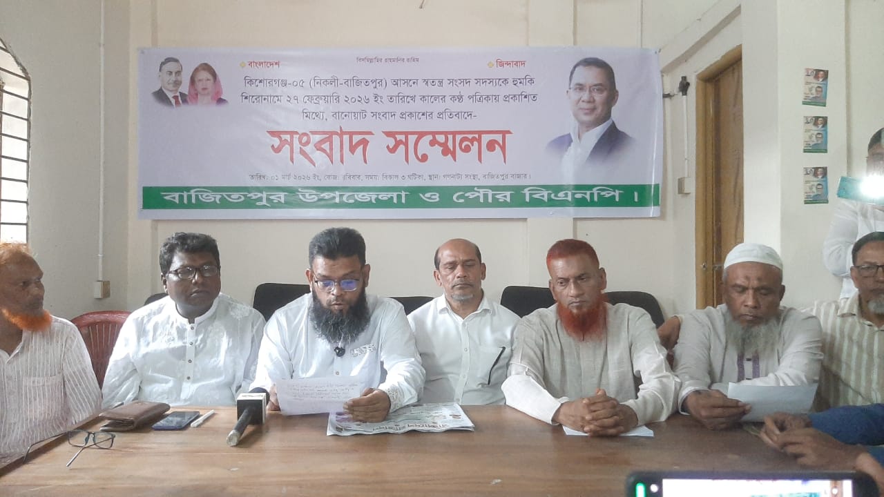 সোমবার ১ মার্চ ২০২৬ বিকাল তিন ঘটিকায় বাজিতপুর গণনাট্যমঞ্চে এই সংবাদ সম্মেলন অনুষ্ঠিত হয়েছে। কিশোরগঞ্জ-৫ (নিকলী–বাজিতপুর) আসনে স্বতন্ত্র সংসদ সদস্যকে হুমকির অভিযোগে জাতীয় দৈনিক দৈনিক কালের কণ্ঠ ও বাংলাদেশ প্রতিদিন-এ প্রকাশিত সংবাদের প্রতিবাদে বাজিতপুরে সংবাদ সম্মেলন করেছে বিএনপি।