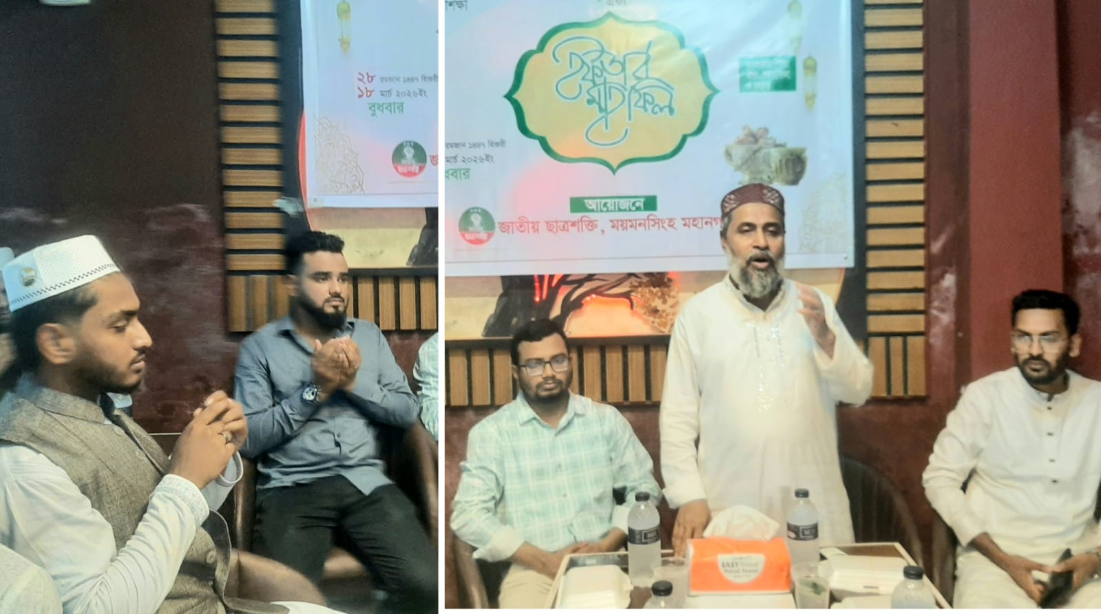 জাতীয় ছাত্রশক্তির মহানগর শাখার আহবায়ক সাইফ চৌধুরী , যুগ্ম আহবায়ক বুরহান সুলতানা মুগ্ধ,মুখ্য সংগঠক নিউরনের সার্বিক তত্বাবধানে আয়োজিত ইফতার মাহফিলে বিশেষ অতিথি হিসেবে বৈষম্য বিরোধী ছাত্র আন্দোলন মহানগর শাখার আহবায়ক নাফিউস সুলতান রুহান,যুবশক্তির মুখ্য সংগঠক দেলোয়ার হোসেন সাদী, সাধারণ সম্পাদক মামুন ফরাজীসহ বৈষম্য বিরোধী আন্দোলন,যুবশক্তি ও জাতীয় ছাত্রশক্তির ময়মনসিংহ জেলা ও মহানগর শাখার নেতাকর্মীরা উপস্থিত ছিলেন।