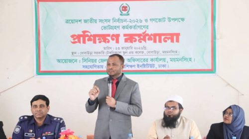 আরিফ রববানী ময়মনসিংহ: ময়মনসিংহের ধোবাউড়া উপজেলায় ত্রয়োদশ জাতীয় সংসদ নির্বাচন-২০২৬ ও গণভোটকে অবাধ নিরপেক্ষ ও সুষ্ঠু পরিবেশে উপহার দেওয়ার লক্ষে ভোটগ্রহণ কর্মকর্তাগণের প্রশিক্ষণ কর্মশালা অনুষ্ঠিত"হয়েছে। শুক্রবার (২৩ জানুয়ারি ২০২৬) নির্বাচনী…