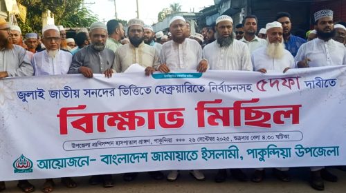 জুলাই সনদের ভিত্তিতে জাতীয় নির্বাচনসহ ৫ দফা দাবিতে পাকুন্দিয়া জামায়াতে ইসলামীর বিক্ষোভ মিছিল